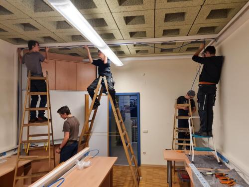 Die Schüler der Fachbereiche Elektro und KFZ wirkten tatkräftig bei der Herstellung der Netzwerkinfrastruktur im neuen Informatikraum mit. Dabei verlegten sie einige Meter an Netzwerkkabel, schlossen die Netzwerkdosen an und prüften diese zugleich auf die richtige Belegung.